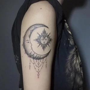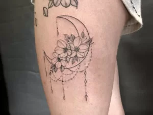 A moon design is a little delicate and intimate tattoo that will work perfectly well with anyone. The moon represents creativity and reflection of emotion. According to Western culture, the moon symbolizes luck, love, and feminism. This lovely design can be done in black, grey, and you and also playing around with colors to make them pop out more.